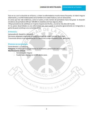 La fiebre tifoidea es una enfermedad causada por la bacteria Salmonella typhi o Salmonella paratyphi que causa fiebre y dolor abdominal. A nivel mundial se estima que causa 16 millones de casos y 600,000 muertes anualmente. En Chile su incidencia ha disminuido significativamente en las últimas décadas. El tratamiento antibiótico más efectivo es la ciprofloxacina por 7 a 10 días.