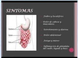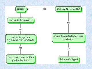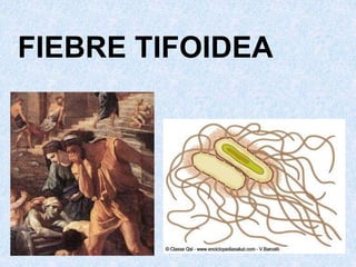 La Fiebre Tifoidea es causada por la bacteria Salmonella typhi e incluye síntomas como fiebre, dolor de cabeza y debilidad. Se transmite a través de alimentos y agua contaminados con las heces o orina de personas infectadas. El tratamiento incluye antibióticos y medidas de prevención como un mejor control de aguas residuales y alimentos.