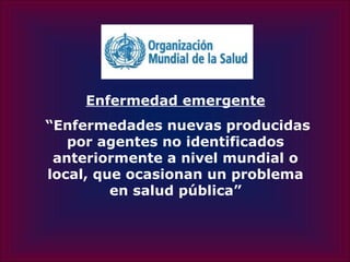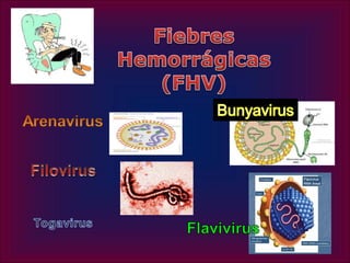 Este documento describe las enfermedades emergentes y reemergentes, incluyendo virus como Ébola, VIH, VHC, SARS, gripe aviar, y dengue. Define las enfermedades emergentes como aquellas causadas por nuevos agentes, y las reemergentes como enfermedades conocidas cuya incidencia ha aumentado. También describe varias fiebres hemorrágicas virales como la de Lassa, Ébola, Junín, Machupo y Guanarito. Finalmente, analiza los hantavirus, filovirus como Ébola y