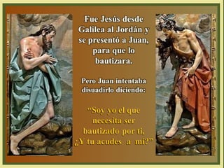 Este documento resume el bautismo de Jesús según el Evangelio de Mateo. Jesús sale del agua luego de ser bautizado por Juan el Bautista, y el Espíritu Santo desciende sobre él en forma de paloma mientras una voz desde el cielo declara "Este es mi Hijo, el amado, mi predilecto".