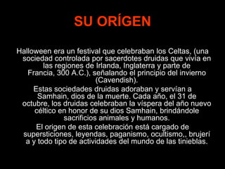 Halloween tiene sus orígenes en una antigua festividad celta llamada Samhain en honor al dios de la muerte. Los druidas realizaban sacrificios humanos y animales durante esta celebración. Actualmente, aunque se presenta como una fiesta inocente, conserva elementos de ritos paganos y es una fecha importante para los satanistas. La Biblia advierte contra la participación en prácticas ocultistas como la adivinación o la hechicería.