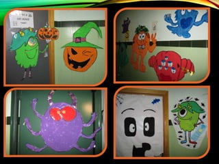Este documento describe las actividades de una fiesta de Halloween en una escuela infantil. Durante dos semanas, los estudiantes y maestros decoraron el colegio con murciélagos, monstruos, calabazas y brujas. En el día de la fiesta, los niños bailaron canciones de Halloween en el gimnasio y luego disfrutaron de teatro de sombras, túneles del terror y manualidades relacionadas con la temática. El objetivo fue brindar una celebración divertida e interactiva para los estudiantes.