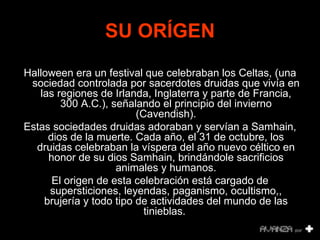 El documento resume el origen pagano de Halloween como una celebración celta en honor al dios de la muerte Samhain. Los druidas realizaban sacrificios humanos y animales durante rituales que involucraban el uso de disfraces y calabazas con velas. Aunque la festividad se ha vuelto más comercial, aún es reconocida por algunos grupos satánicos como una noche importante para sus rituales ocultistas. La Biblia advierte contra la participación en prácticas paganas como la adivinación o la hechicería.