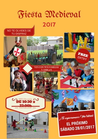 La fiesta medieval de este año se llevará a cabo el próximo sábado 28 de enero de 2017 de 10:30 a 23:00 horas. Se espera que sea una fiesta llena de diversión para las familias y amigos que asistan disfrazados.