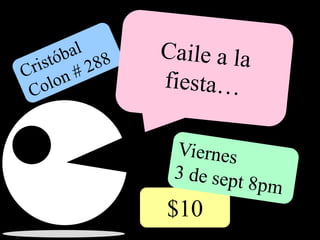 La invitación anuncia una fiesta de cumpleaños el 3 de septiembre a las 8 pm en la calle Cristóbal Colón 288 con un costo de $10. Felicita a alguien por su cumpleaños en septiembre de 2009.
