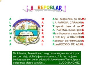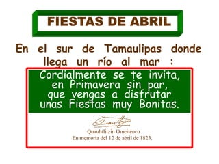 Este documento contiene varios poemas y canciones que celebran las fiestas de abril en la región de Tamaulipas, México. Los poemas describen las bellezas naturales de la región como los ríos, mares, playas y campos petroleros. Alaban las ciudades de Altamira, Tampico y Ciudad Madero e invitan a los lectores a disfrutar de las fiestas de primavera y la hospitalidad de la gente local.