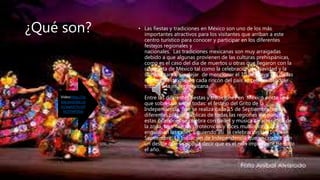 Las principales fiestas y tradiciones en México incluyen el Día de los Muertos, el Grito de la Independencia el 15 de septiembre, la Semana Santa y la Navidad. Muchas de estas tradiciones se remontan a las culturas prehispánicas pero también incluyen celebraciones introducidas por los españoles como la Navidad y la Semana Santa. Las fiestas son una parte importante de la cultura e identidad mexicana y atraen muchos visitantes cada año.