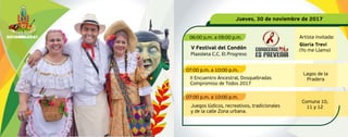 Este documento presenta la programación cultural y deportiva de las Fiestas del Progreso de Dosquebradas del 30 de noviembre al 6 de diciembre de 2017. Incluye eventos como el Festival del Condón, encuentros ancestrales, ferias agroindustriales, conciertos musicales, festivales de teatro, competencias deportivas y más, celebrando los 45 años de Dosquebradas.