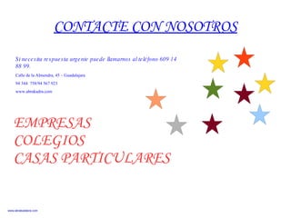 Un documento proporciona información sobre una empresa de entretenimiento infantil llamada Abrakadabra que ofrece payasos, marionetas, juegos, magos, cuentacuentos, comida y postres para fiestas infantiles en empresas, colegios, casas particulares. La empresa se encuentra en Calle de la Almendra 45 en Guadalajara y proporciona sus servicios de entretenimiento y comida con una garantía de calidad.