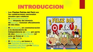 Las Fiestas Patrias del Perú se celebran el 28 y 29 de julio para conmemorar la independencia del país de España. El 28 de julio se recuerda la declaratoria de independencia en Lima por José de San Martín, mientras que el 29 de julio se honra a las fuerzas armadas y policía peruanas. La bandera peruana representa la sangre derramada por los héroes con su color rojo y la libertad con el blanco. Estas fiestas patrias son una ocasión para celebrar la historia y cultura de Perú.