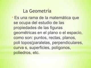 Este documento proporciona información sobre figuras geométricas para el tercer grado. Explica que la geometría estudia las propiedades de figuras en el plano o espacio, como puntos, líneas, planos y polígonos. Luego describe las características básicas del cuadrado, rectángulo, triángulo y círculo, las figuras geométricas más comunes. Cada figura se define por sus lados, vértices y otras propiedades únicas.