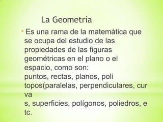 Este documento describe diferentes figuras geométricas como el cuadrado, rectángulo, triángulo y círculo. Explica que la geometría estudia las propiedades de figuras en el plano o espacio como puntos, líneas, planos y polígonos. También brinda una breve historia de la geometría como una de las ciencias más antiguas relacionada con longitudes, áreas y volúmenes.