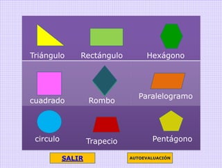 El documento presenta las definiciones y fórmulas para calcular el área de diferentes figuras planas como triángulos, cuadrados, rectángulos, círculos, rombos, trapecios, hexágonos, paralelogramos y pentágonos.
