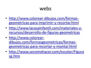 El documento lista cuatro sitios web que contienen recursos sobre figuras geométricas, incluyendo dibujos para colorear, imprimir y recortar, así como materiales y actividades para el desarrollo de formas geométricas en niños.