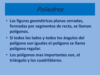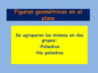 El documento resume las figuras geométricas planas más importantes, dividiéndolas en poliedros (figuras formadas por segmentos de línea cerrados como polígonos) y no poliedros (figuras no formadas por segmentos como la circunferencia y elipse). Describe los polígonos más comunes como el triángulo, cuadriláteros y pentágonos, así como sus propiedades. También define la circunferencia, elipse y sus características.