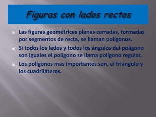 El documento clasifica diferentes figuras geométricas planas en dos grupos: figuras con lados rectos como polígonos y figuras con lados no rectos como circunferencias y elipses. Luego describe las propiedades y fórmulas clave de triángulos, cuadriláteros, polígonos de más lados, circunferencias y elipses.