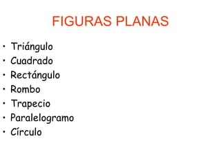 El documento lista diferentes figuras geométricas, incluyendo triángulos, cuadrados, rectángulos, rombos, trapecios y paralelogramos como figuras planas, y cubos, prismas, pirámides, conos, cilindros y esferas como cuerpos con volumen.