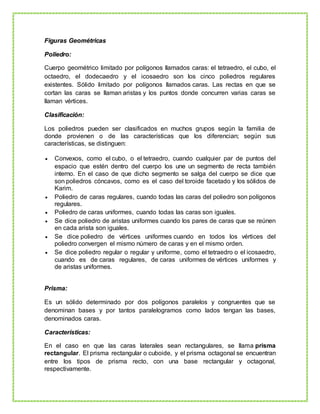 El documento describe diferentes figuras geométricas, incluyendo poliedros, prismas, cilindros, esferas, triángulos, cuadriláteros, paralelogramos, rectángulos, rombos, cuadrados, círculos y semicírculos. Define cada figura y explica sus características y clasificaciones.