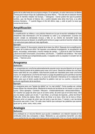 Este documento define y proporciona ejemplos de varias figuras literarias, incluyendo alegoría, aliteración, alusión, amplificación, anagrama, analogía, anástrofe, antropomorfismo, antítesis, aforismo, arquetipo y asonancia. Explica cada una brevemente y ofrece uno o dos ejemplos cortos para ilustrar su uso en la literatura.