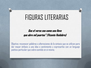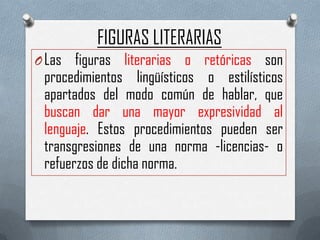 Este documento define y clasifica diferentes figuras literarias o retóricas. Explica que son procedimientos lingüísticos que buscan dar mayor expresividad al lenguaje. Las divide en tres grupos: figuras semánticas, figuras de pensamiento y figuras sintácticas. Luego procede a definir y dar ejemplos de figuras específicas como la metáfora, sinécdoque, hipérbole, antítesis e ironía.