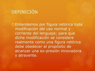Este documento define las figuras literarias como modificaciones del lenguaje normal para lograr una expresión innovadora y atractiva. Explica que existen diferentes clases de figuras retóricas, incluyendo figuras de posición que alteran el orden de los elementos en la oración, como la anástrofe e hipérbaton, y la mixtura verborum que causa un caos sintáctico al acumular estas figuras. Además, clasifica las figuras literarias dependiendo de si rompen o insisten en el orden regular de los elementos de la oración.