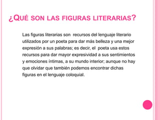 Este documento define y explica varias figuras literarias como la alegoría, metáfora, sinécdoque, metonimia, hipérbole y otras. Explica que las figuras literarias son recursos del lenguaje que los poetas usan para dar más belleza y expresividad a sus palabras. Luego describe diferentes tipos de figuras literarias como las fonológicas, semánticas, pragmáticas y descriptivas, dando ejemplos de cada una.