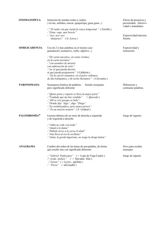 Este documento define y explica varias figuras retóricas o recursos literarios que los autores utilizan para aumentar la belleza, agudeza e ingenio de sus obras. Describe figuras fonéticas, morfosintácticas y de otros tipos, como aliteración, anáfora, onomatopeya, hipérbaton, paralelismo y perífrasis. Explica que estas figuras resaltan aspectos como la pronunciación, significado o estructura de los textos, y que cumplen funciones como producir sensaciones particulares, destac