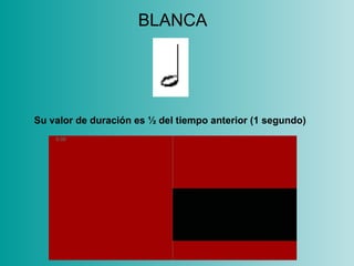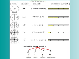 El documento describe las figuras musicales comunes y sus valores de duración relativos a una redonda de 2 segundos. Explica que la redonda dura 2 segundos, la blanca 1 segundo, la negra 0.5 segundos, la corchea 0.25 segundos y la semicorchea 0.13 segundos. También indica que existe un silencio equivalente para cada figura musical.