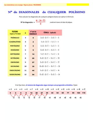 Los polígonos son figuras planas formadas por líneas rectas cerradas. Tienen elementos como lados, vértices y ángulos. La suma de los ángulos interiores de cualquier polígono es (n-2)×180°, donde n es el número de lados. La suma de los ángulos exteriores de cualquier polígono es siempre 360°. Los polígonos regulares tienen ángulos interiores, exteriores y centrales que miden lo mismo, calculado como 360°/n.
