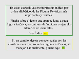 El documento presenta un índice alfabético de figuras retóricas literarias comunes, con definiciones y ejemplos. También clasifica las figuras retóricas según diferentes niveles lingüísticos como fonético, morfosintáctico o semántico. Finalmente, ofrece otra clasificación según el procedimiento lingüístico empleado, distinguiendo entre figuras de orden, repetición, significado y supresión.