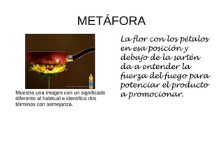 El documento describe diferentes figuras retóricas utilizadas en imágenes publicitarias, como la metáfora, antítesis, hipérbole, comparación, hipérbaton, prosopopeya, sinécdoque, elipsis, paradoja, perífrasis, metonimia, onomatopeya, eufemismo y anáfora. Cada una se define brevemente y se incluye un ejemplo de imagen que ilustra su uso.