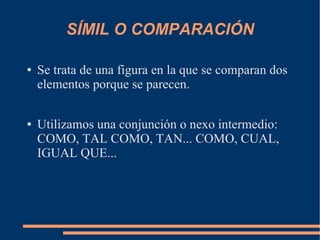 Este documento describe varias figuras literarias que se utilizan comúnmente en publicidad, incluyendo el símil o comparación, la metáfora, la aliteración, la onomatopeya, la hipérbole, la paradoja, la personificación, la metonimia y la dilogía. Algunos ejemplos citados son "Petit Suisse alimenta como un bistec" para la comparación, y "El teclado armónico de su risa fina" para la metáfora.