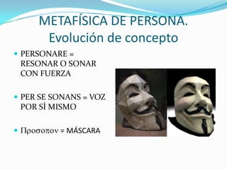 Este documento resume la evolución filosófica del concepto de persona a través de la historia. Comienza con las definiciones etimológicas de "persona" y luego describe las perspectivas clásica, cristiana, tomista, racionalista, voluntarista y personalista. Finalmente, destaca los elementos metafísicos clave de la persona como la subsistencia, incomunicabilidad, racionalidad, individualidad y unidad sustancial.