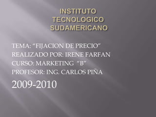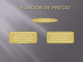 El documento habla sobre la fijación de precios. Explica que el precio es lo que el consumidor está dispuesto a pagar por un producto y que está influenciado por factores internos y externos de la organización, así como por la competencia y las condiciones del mercado. También identifica errores comunes como fijar el precio demasiado en base a los costos o no modificarlos con suficiente frecuencia.