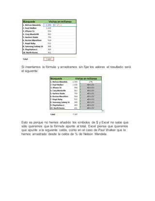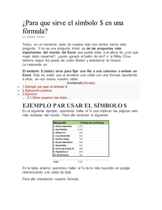 El símbolo $ en Excel sirve para fijar una celda de referencia y evitar que la fórmula se mueva al arrastrar la celda. Al añadir $ antes del número de fila o columna en una fórmula, se fija esa parte de la referencia cuando se arrastra la fórmula. Por ejemplo, $A1 fijaría la columna A al arrastrar la fórmula, mientras que A$1 fijaría la fila 1. Esto permite arrastrar una fórmula y mantener parte de la referencia fija.