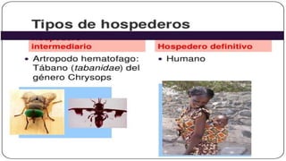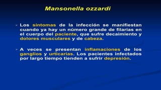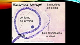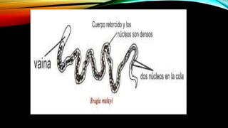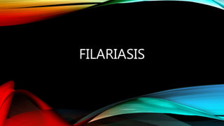 Este documento proporciona información sobre diferentes tipos de filariasis, incluyendo su definición, ciclo de vida, síntomas, diagnóstico y tratamiento. La filariasis es causada por parásitos nematodos transmitidos por picaduras de mosquitos. Existen tres tipos principales: filariasis linfática, cutánea y corporal. La filariasis linfática más común es causada por Wuchereria bancrofti y puede causar elefantiasis. La oncocercosis es una filariasis cutánea transmitida por la mosca Simul
