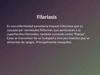 La filariasis es una enfermedad parasitaria tropical causada por nematodos filiformes transmitidos por mosquitos. Los agentes causales principales son Wuchereria bancrofti y Brugia malayi. El ciclo de vida incluye etapas de adulto, microfilaria y larva, y se transmite cuando los mosquitos pican a humanos infectados. Los síntomas incluyen linfedema y elefantiasis. El diagnóstico se realiza clínicamente o mediante exámenes parasitológicos e inmunológicos. El tratamiento inclu
