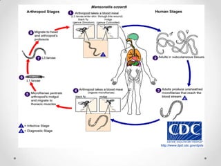 La filariasis es causada por nematodos del género Wuchereria, Onchocerca, Brugia y otros. Los adultos viven en los vasos linfáticos y tejidos donde la hembra deposita microfilarias. Estas son ingeridas por mosquitos y se desarrollan hasta la forma infectante. Al picar el mosquito, inocula las microfilarias que maduran causando inflamación y a largo plazo elefantiasis. El diagnóstico se realiza encontrando microfilarias en sangre nocturna. La prevención incluye