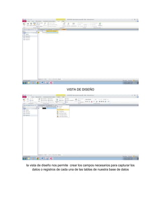 Este documento describe cómo crear tablas en una base de datos de Access 2010 utilizando la vista de diseño. Explica que la vista de diseño permite crear campos para capturar datos, y que se pueden configurar propiedades para los campos como insertar, eliminar, copiar y pegar. También menciona que existe una vista de hoja de datos para ver y editar los datos de cuatro tablas.