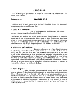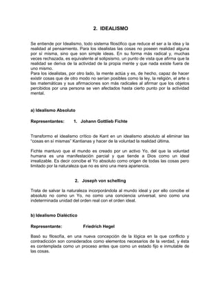 El documento presenta resúmenes de varias teorías y corrientes filosóficas. Expone el criticismo de Kant y su trilogía crítica. Luego describe el idealismo absoluto de Fichte y Schelling, el idealismo dialéctico de Hegel y su concepción del espíritu absoluto. También resume el positivismo de Augusto Comte y su ley de los tres estadios, así como el materialismo mecanicista de Feuerbach y el materialismo dialéctico de Marx. Por último, presenta una breve definición del vitalismo.