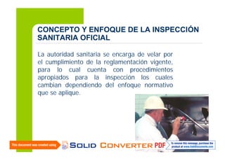 Este documento resume los principales aspectos de la inspección veterinaria en plantas de beneficio animal en Colombia. Explica que el gobierno nacional estableció parámetros para el funcionamiento de las plantas bajo control de riesgo. También describe los cambios en el enfoque normativo de inspecciones, incluyendo un enfoque basado en el riesgo y preventivo en lugar de correctivo. Finalmente, presenta datos sobre el número de plantas registradas e inscritas en el país.