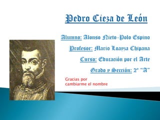 Pedro Cieza de León fue un conquistador y cronista español del siglo XVI que escribió una Crónica del Perú en tres partes. Nació en España en 1520 y se embarcó a América a los 15 años, donde participó en la fundación de varias ciudades en Colombia como San Ana de los Caballeros y Cartago. En 1548 viajó a Lima y comenzó su carrera como escritor y cronista oficial del Perú, recorriendo el territorio durante dos años para recopilar información para su obra.