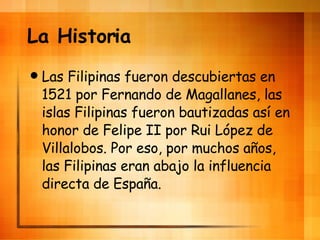 Las Filipinas fueron descubiertas por Fernando de Magallanes en 1521 y nombradas en honor a Felipe II por Rui López de Villalobos. Después de años bajo dominio español, los filipinos proclamaron su independencia en 1898 pero las islas fueron cedidas a los Estados Unidos, lo que provocó una nueva insurrección. Japón ocupó Filipinas durante la Segunda Guerra Mundial y el país logró su independencia en 1946.