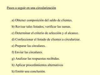 El documento describe los pasos a seguir en una circularización a clientes, que incluyen obtener el saldo de clientes, revisar y verificar las sumas, determinar el criterio de selección y alcance, confeccionar el listado de clientes, preparar y enviar las circulares, analizar las respuestas, aplicar procedimientos alternativos si es necesario, y emitir una conclusión.