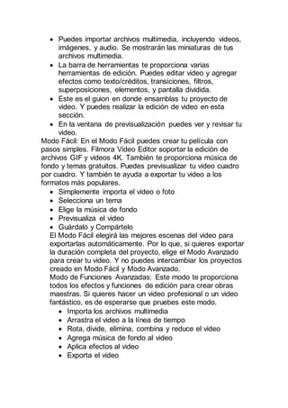 Filmora Video Editor es un software de edición de video para usuarios de Windows con diferentes niveles de experiencia. Ofrece herramientas básicas y avanzadas de edición como cortar, combinar y agregar efectos. Incluye un modo fácil para principiantes y un modo avanzado para usuarios experimentados. Los usuarios pueden crear y exportar videos profesionales a diferentes formatos.