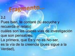 Los fragmentos presentados describen diferentes teorías filosóficas. El primero discute las únicas vías de investigación que son pensables según Parmenides: que el ser es y no es no-ser, y que no es y es no-ser. Otro fragmento afirma que el ser no tiene ni fin ni inicio y permanece igual. Finalmente, un fragmento contrasta esta visión con la opinión de que las cosas nacen, crecen y mueren en un cambio constante.
