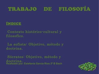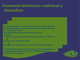 El documento describe el contexto histórico y filosófico de la Grecia del siglo V a.C, cuando florecieron las ideas de los sofistas y Sócrates. Los sofistas eran maestros itinerantes que enseñaban retórica y relativismo epistemológico. Su objetivo era triunfar social y políticamente. Sócrates, en contraste, usaba el diálogo y la mayéutica para ayudar a la gente a descubrir la verdad universal sobre el bien y la justicia dentro de sí mismos.