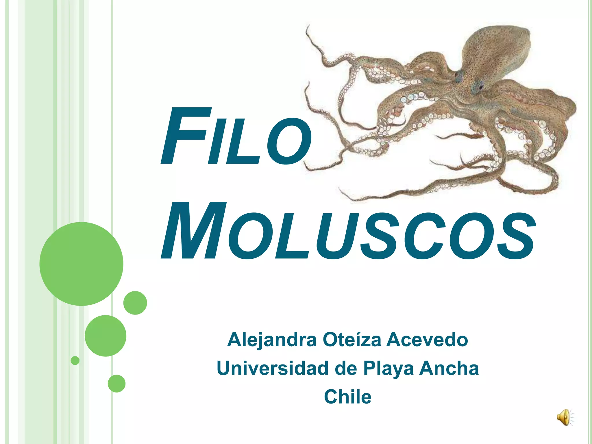 El documento describe el filo Moluscos, incluyendo sus objetivos, generalidades, características, modelo corporal y sus diferentes clases. El filo Moluscos contiene varias clases de moluscos como gastrópodos, bivalvos y cefalópodos.