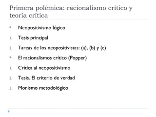 Este documento resume dos polémicas principales en epistemología e investigación científica. La primera es entre el racionalismo crítico de Popper y la teoría crítica de la Escuela de Frankfurt. La segunda es entre el neopositivismo y la hermenéutica. En la primera polémica, Popper critica el neopositivismo y propone el criterio de verdad y monismo metodológico, mientras que la Escuela de Frankfurt critica el reduccionismo del positivismo. En la segunda polémica, el neopositivismo define cuatro caracter