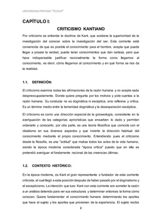 Este documento resume el pensamiento filosófico de Immanuel Kant. Explica que Kant introdujo el criticismo, examinando críticamente todas las afirmaciones de la razón humana. También describe los tres grados para llegar al conocimiento según Kant: a través de la sensibilidad y la razón. Finalmente, resume brevemente la biografía de Kant y algunas de sus obras más importantes como la Crítica de la Razón Pura, la Crítica de la Razón Práctica y su pensamiento sobre la estética.